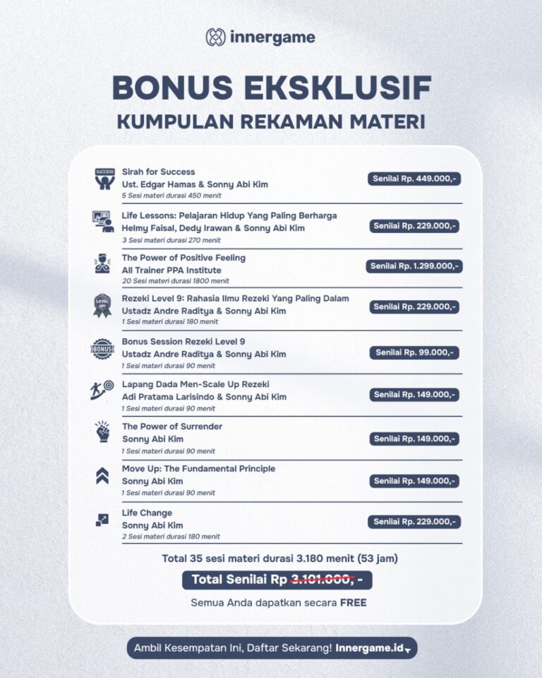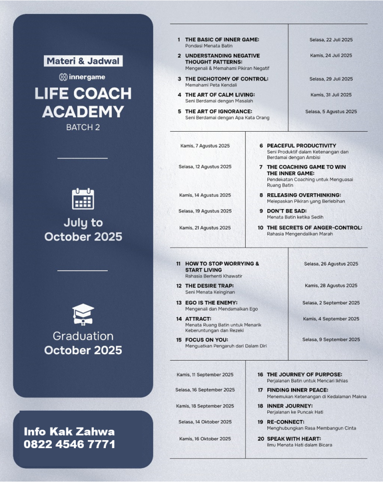 SelamaĀ 3 bulan,Ā belajar dan berlatihĀ 20 modul materi fundamentalĀ tentangĀ inner masteryĀ yang bisa disampaikan di berbagai sesi inspirasi: seminar, pelatihan, majelis ta’lim, kelas online, Coaching Session, dan lain sebagainya.